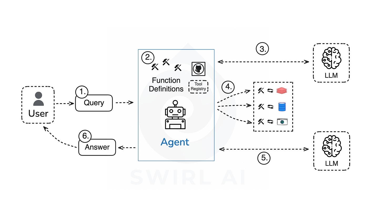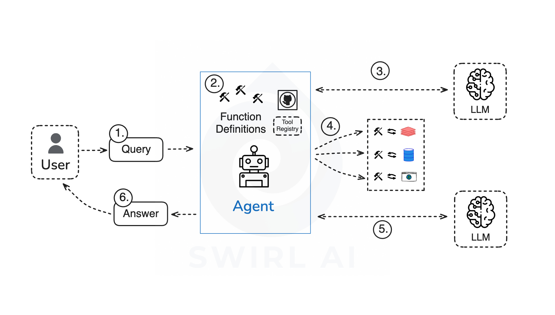 The list of available Tools is passed together with the User Query to a LLM via a prompt. The LLM figures out which functions need to be invoked and with what parameters.