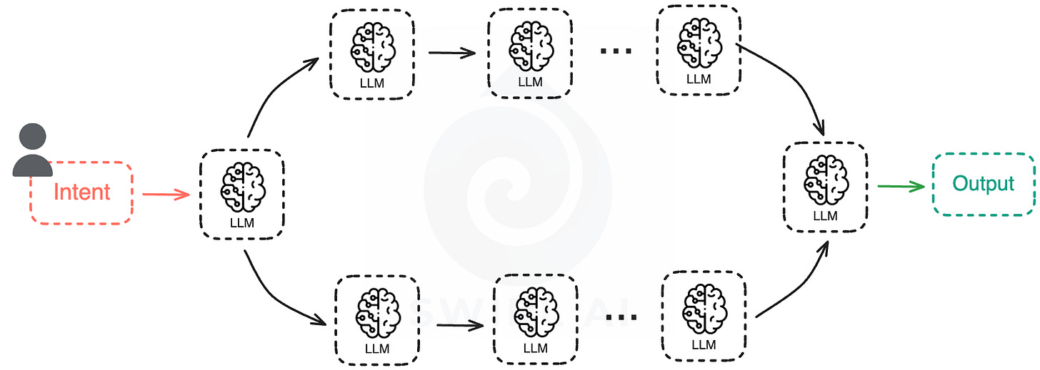 In simple terms, it is a topology of LLM calls connected via different patterns. It could be an iteration loop or a more sequential pattern. But the main thing to take out from this is that each output of an LLM node influences the downstream system.