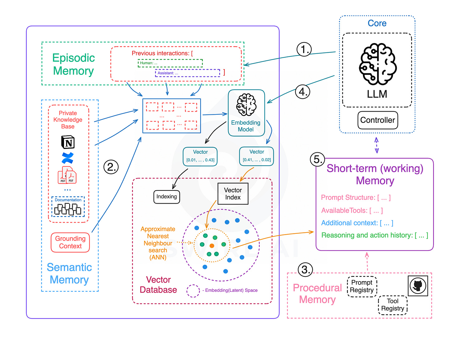 All of the information pulled together from the long-term or stored in local memory is called short-term or working memory. Compiling all of it into a prompt will produce the prompt to be passed to the LLM and it will provide further actions to be taken by the system.